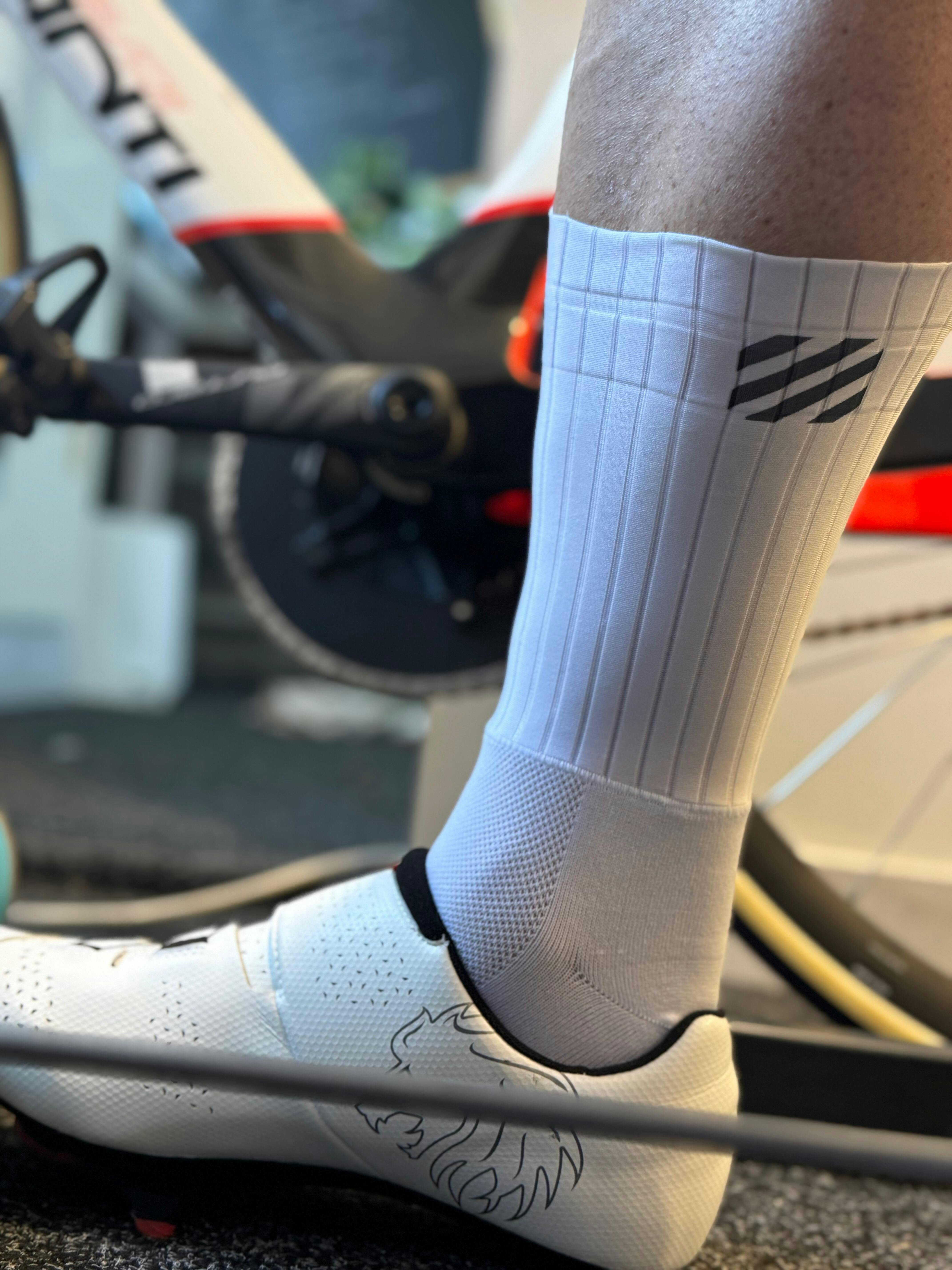 Velobike Aero Socks are well suited for track cyclists and especially with riders with larger calves. The ribbed material works as a trip strip - reducing flow separation around the leg, while offering superior stretch for both small and larger legs. The dual grip strips provide a secure hold without them falling down.