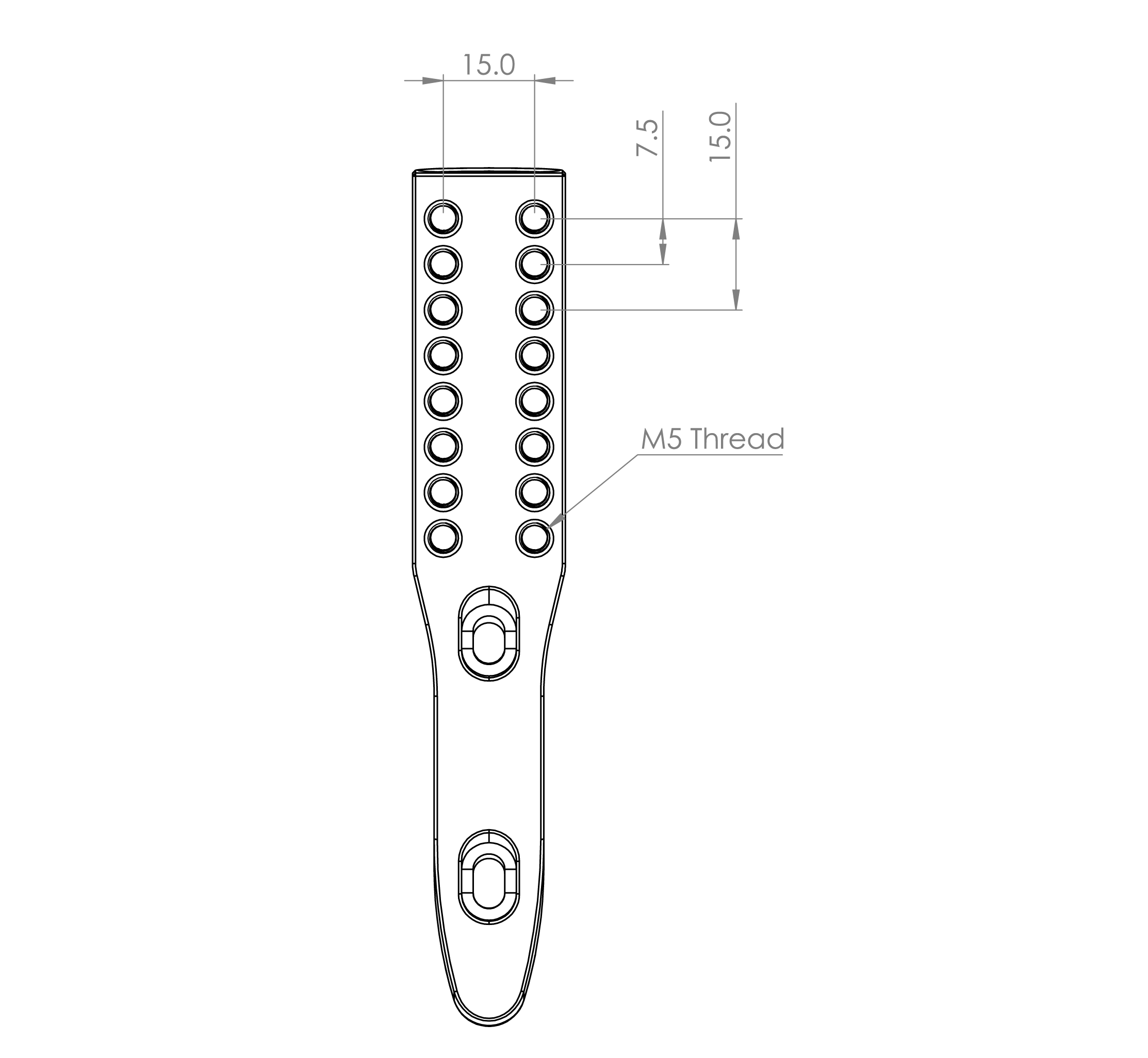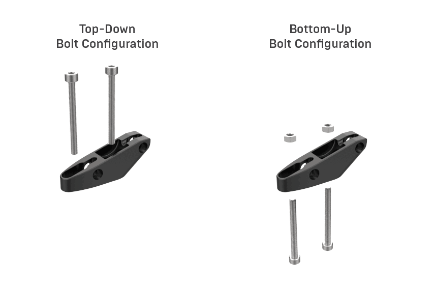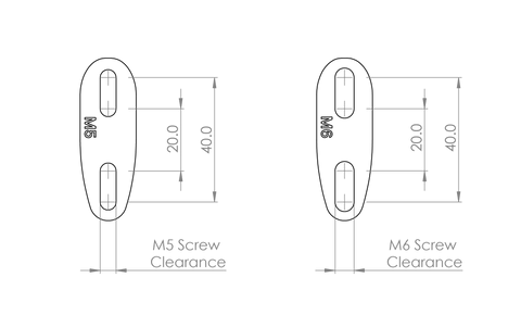 The risers are compatible with almost any base bar. The risers can fit onto base bars with bolt spacing from 20mm through to 40mm, in M5 or M6 bolt sizes, and with a bottom-up or top-down bolting configuration. Note that when mounting in a bottom-up bolt configuration, a nut is held captive within the riser (fastenings not included).